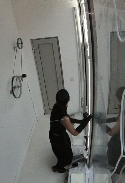 I WOMEN 100 WATT is an interactive installation and performance that explores the entanglement of domestic labour, burden, and hope within patriarchal capitalism by featuring a female cleaning worker whose wrists are cuffed in solid steel and connected to a hand-operated generator. As she cleans a large glass window in front of spectators, the movement of her hands activates the generator, producing electricity that powers LED strips of around 100 watts and illuminates the space. The window is continuously dirtied by the spectators triggering sensors and pumps, as they may either withdraw and leave the performance, or remain and force her to continue cleaning.